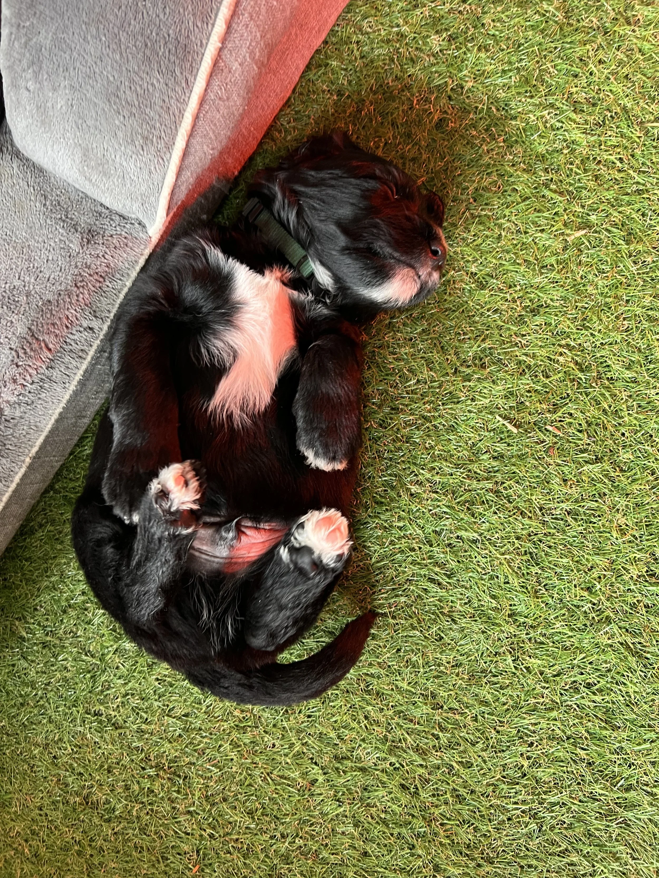 We begin laying the groundwork for potty training early by intentionally creating separation between sleeping space and bathroom space. Just outside of their whelping and resting area, the puppies have access to a safe, indoor grass turf station where they are encouraged to do their business.